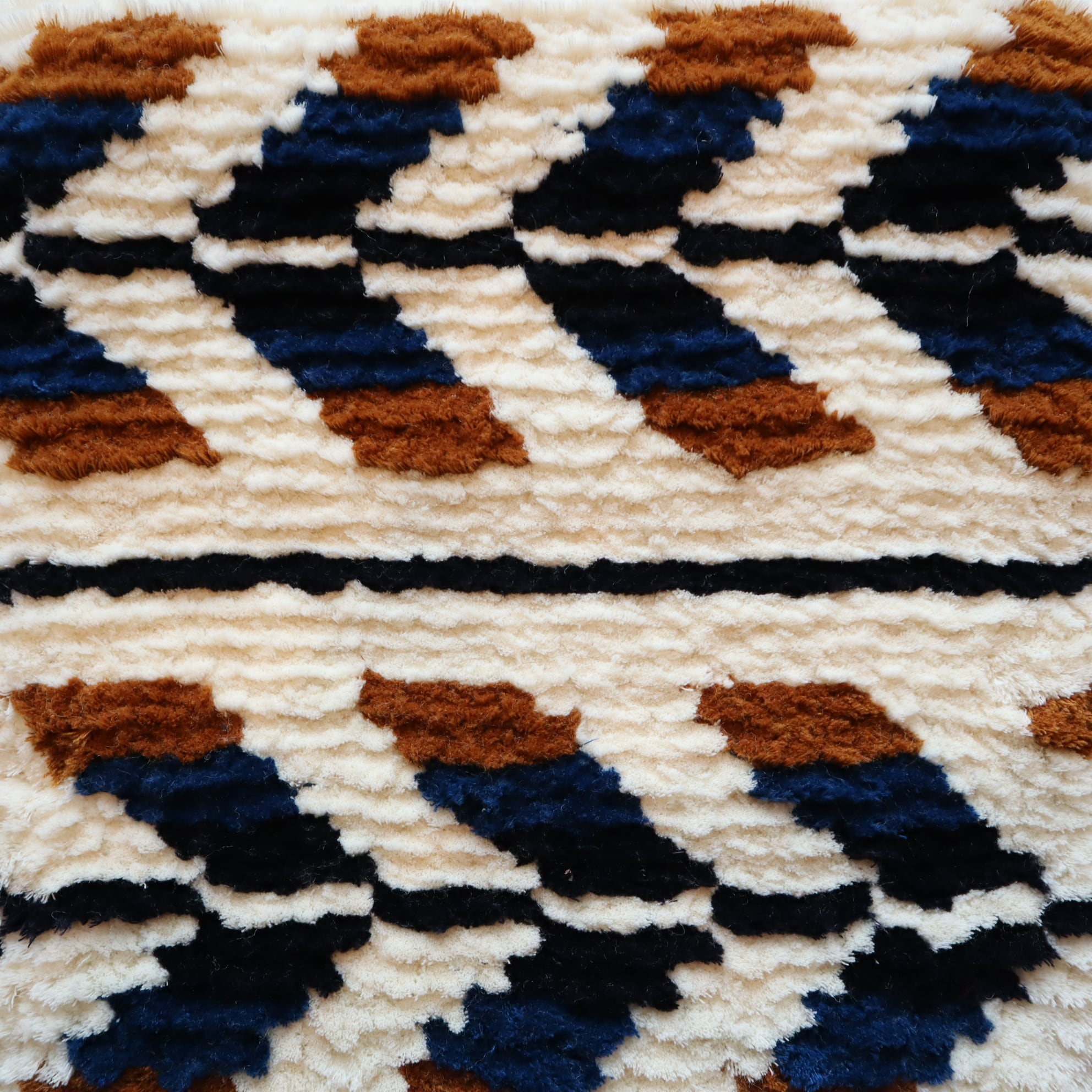 約150本の束にした上質なメリノウール糸を用い、緯糸(よこいと)を経糸(たていと)に一目ずつ絡めて結び毛足を切りそろえる作業を何度も繰返し、ようやく1枚が完成するノッティング。