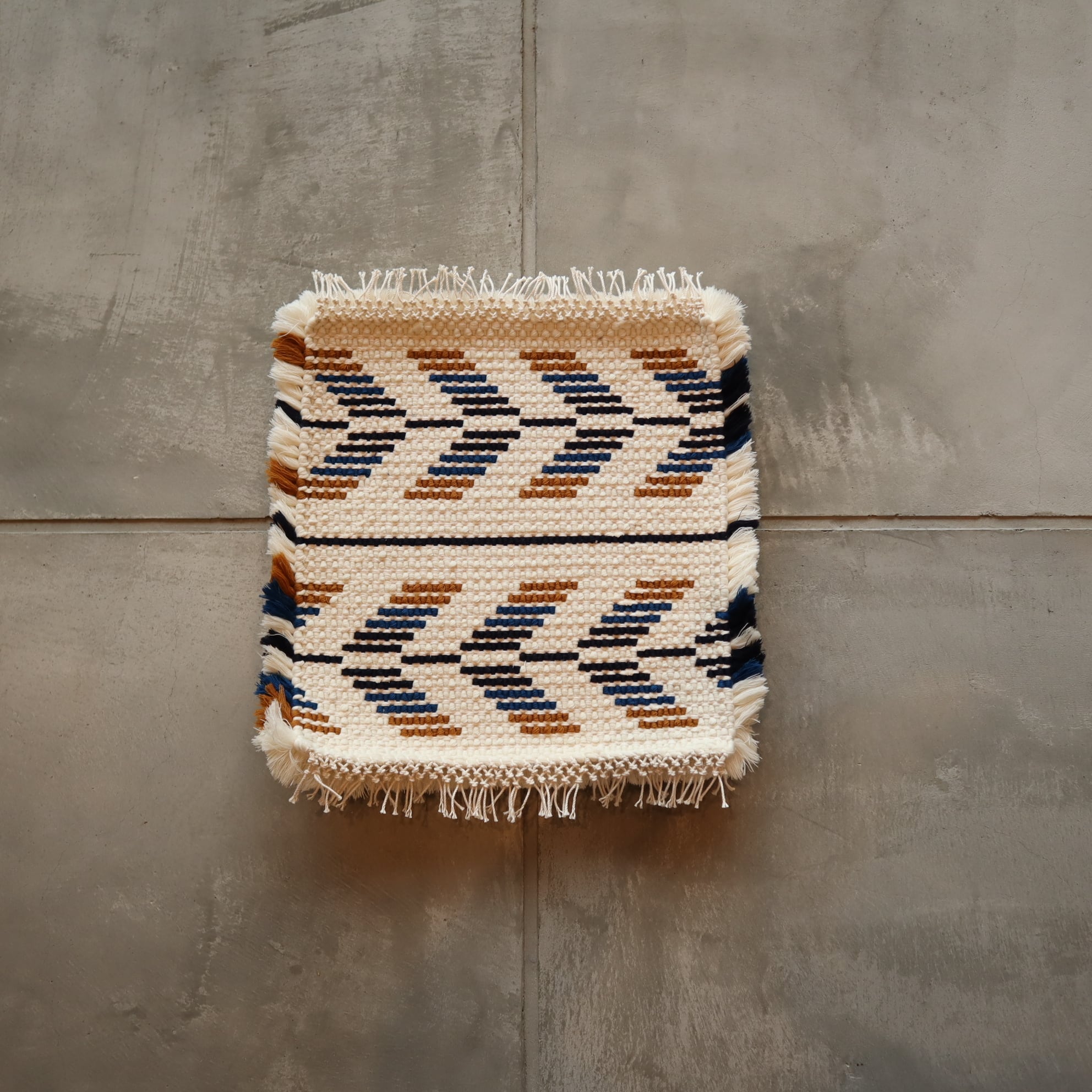 旅先の倉敷で偶然出会ったノッティングの椅子敷に魅了され、倉敷本染手織研究所に入所。卒業後も「健康で威張らず責任を持って仕事をする」を銘として地元和歌山で制作を続ける日々。