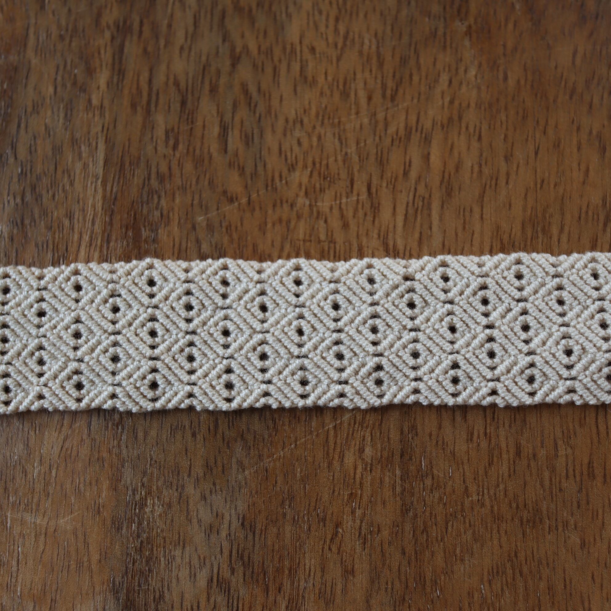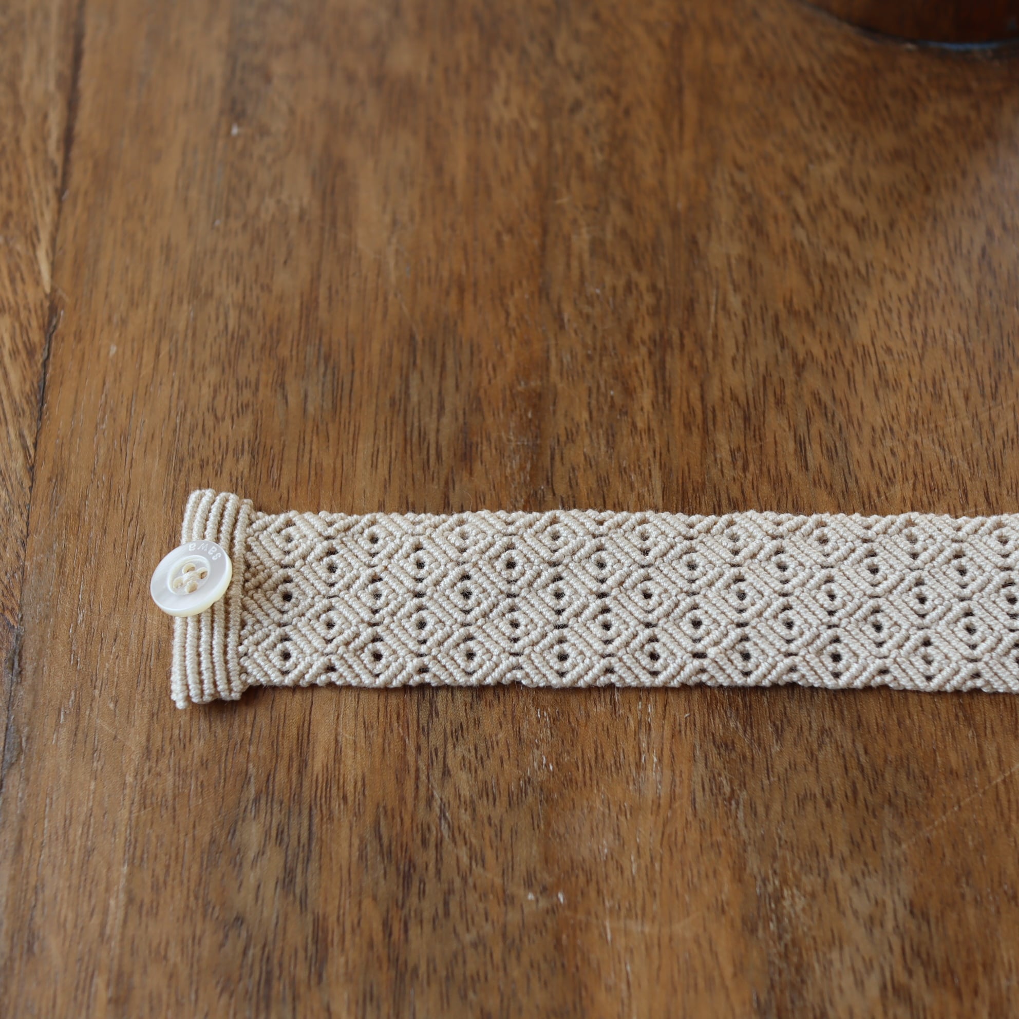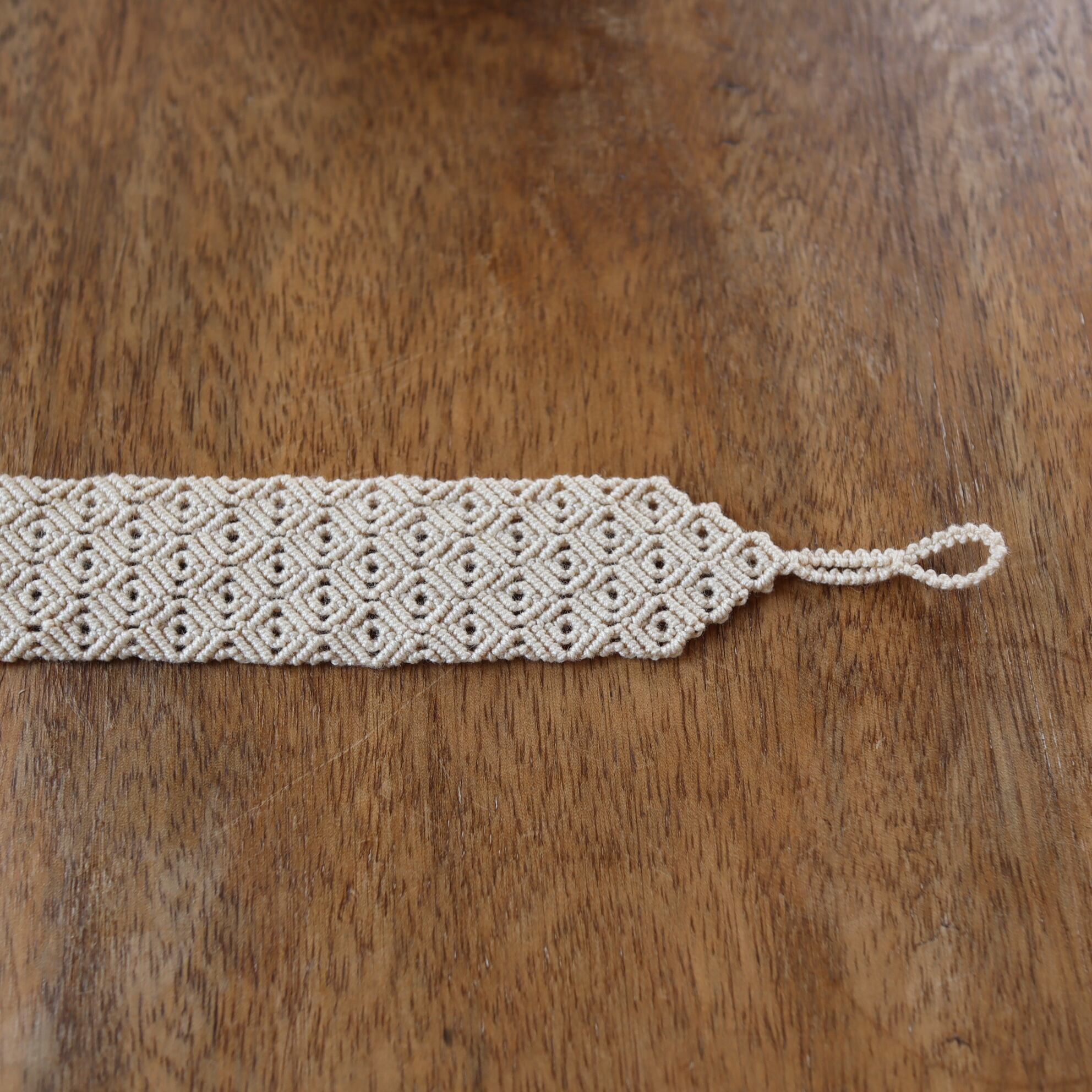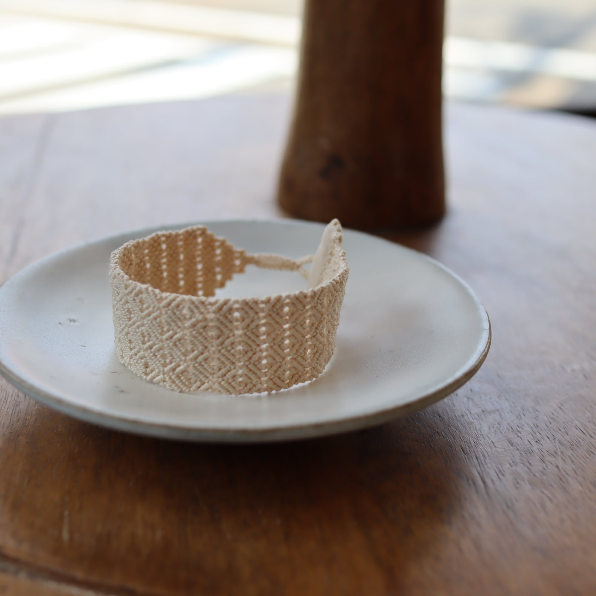 クラシックレースの教室で糸を結びあわせて形や模様を作り出す「マクラメレース」の技法に出会い、オリジナルの作品を作り始める。
