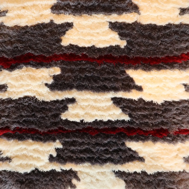 約150本の束にした上質なメリノウール糸を用い、緯糸(よこいと)を経糸(たていと)に一目ずつ絡めて結び毛足を切りそろえる作業を何度も繰返し、ようやく1枚が完成するノッティング。