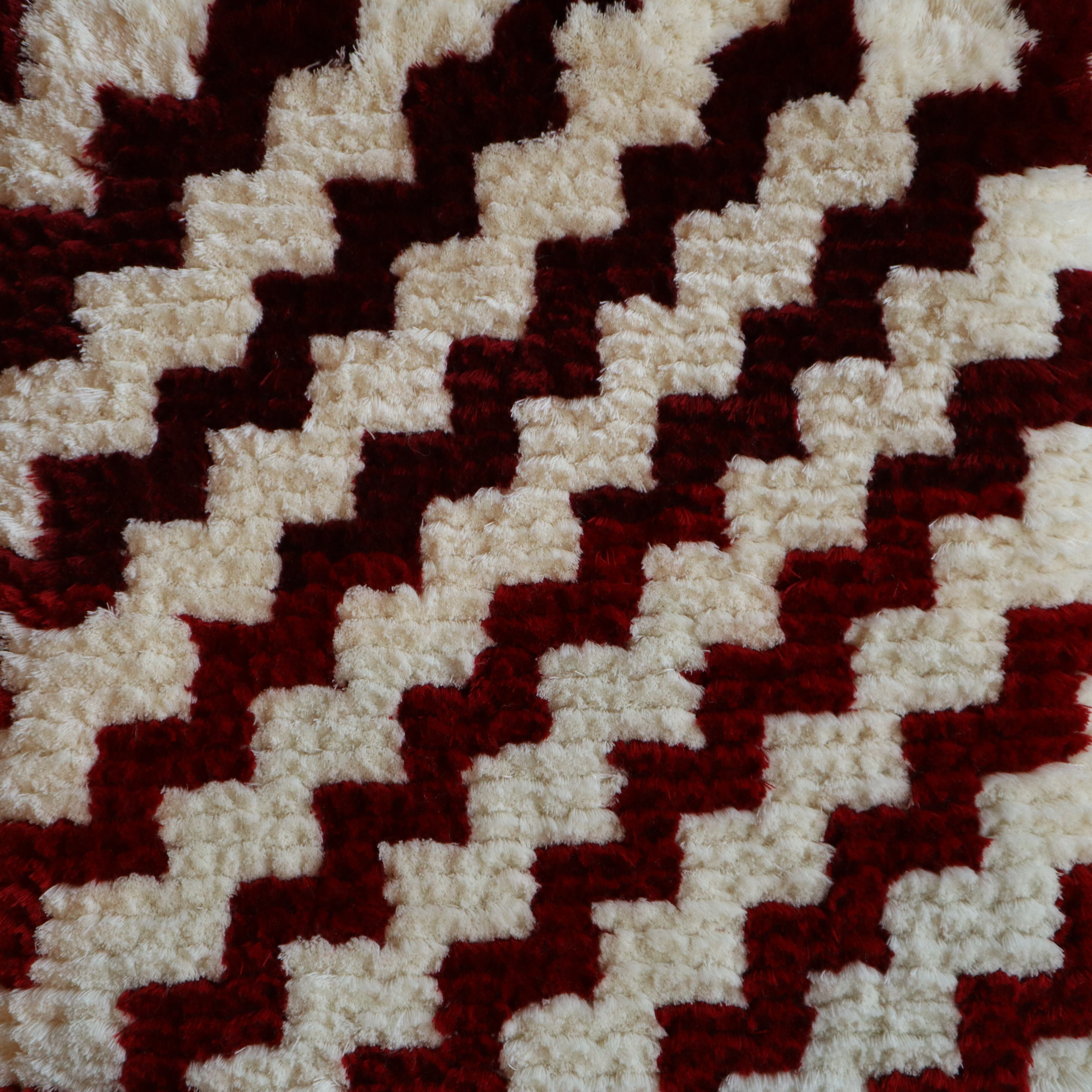 約150本の束にした上質なメリノウール糸を用い、緯糸(よこいと)を経糸(たていと)に一目ずつ絡めて結び毛足を切りそろえる作業を何度も繰返し、ようやく1枚が完成するノッティング。